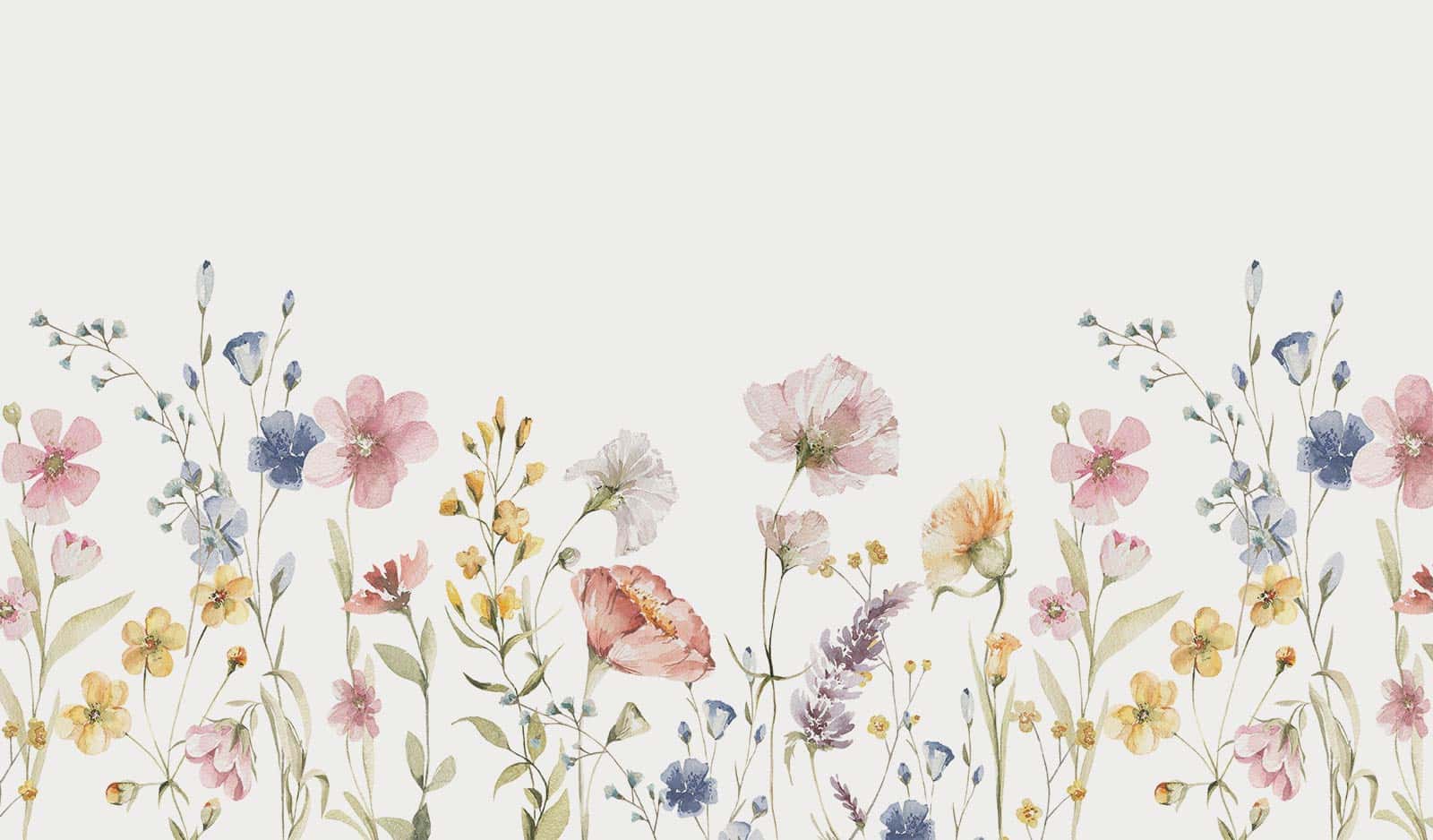 טפט קיר פריחה אביבית מעוצב עם מגוון פרחי בר צבעוניים ויפים על רקע בהיר ונעים.